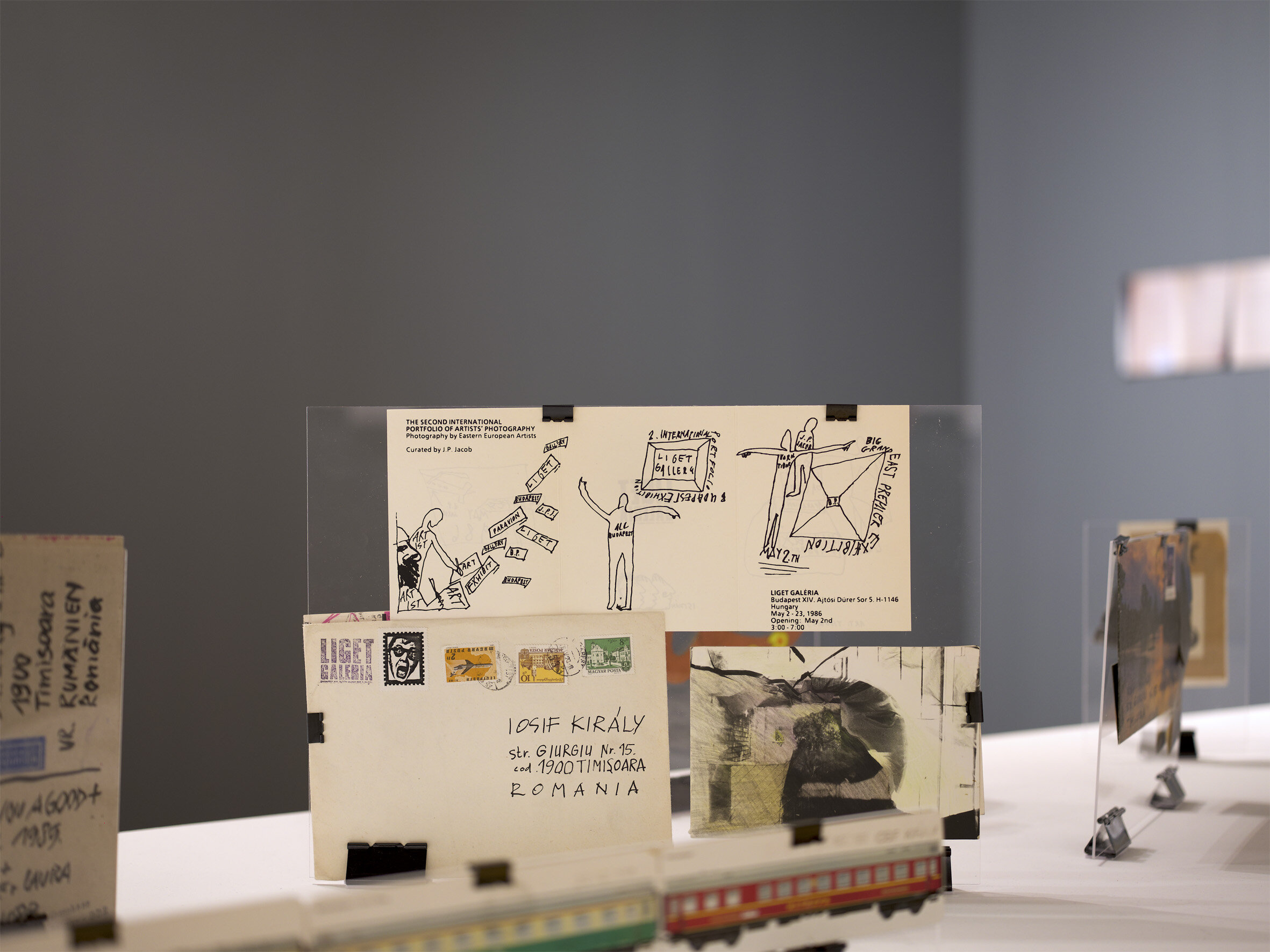 Ca să ne apropiem de formatul expoziției, am ținut la două idei pe care Ioji le-a acceptat. Am vrut ca la etajul doi, arta poștală să fie în cabinetul din spatele sălii, format din pereții existenți. Eu îi zic cabinet, e un spațiu foarte clar delimitat și mi s-a părut că acolo trebuie să expunem arta poștală pentru că nu avea rost să o dispersăm în restul spațiului. Iar a doua sau poate prima premisă de la care am plecat a fost un dialog explicit între fotografia care devine „tablou”, de format mare, înrămată, și fotografia de laborator, de format mai mic, care e peste tot în vitrinele care populează cele trei săli. În egală măsură am vrut ca perioada de tinerețe, cea constructivistă, care stă clar sub semnul experimentelor făcute cu profesorii lui, membrii grupului Sigma, să fie evidențiată, pentru că mi se pare că merita și era foarte coerent să o punem separat. Astfel, una dintre sălile laterale ale expoziției e dedicată aproape exclusiv acestei perioade, printr-un un dialog între obiecte (și ele de două feluri, cele făcute în epocă și obiectele care au fost refăcute foarte recent pentru expoziție), fotografii și desene; acestea din urmă mi se par foarte spectaculoase și – din cât am putut să-mi dau seama până acum după mai multe vizite ghidate – constituie o surpriză pentru cei mai mulți vizitatori. Mail-art-ul probabil că este elementul cel mai spectaculos din expoziție, pentru că readuce în atenție ce a însemnat arta poștală, ce eficacetate a avut. Și aici Ioji e foarte explicit în textele lui, el spune foarte limpede cum arta poștală a fost pentru el o gură de aer proaspăt și un soi de unică posibilitate de a avea contact cu „lumea liberă”; ca să-l citez exact „implicarea în mișcarea internațională de mail-art este cea care mi se părea că îmi va marca viitorul în cea mai mare măsură. M-a ajutat să lucrez cu fotografia și cu imaginea, în general, într-un mod foarte dezinvolt și dezinhibat de constrângerile tehnice.” De fapt, Ioji ajunge la fotografie în primul rând pentru că trebuia să documenteze ceea ce era perisabil sau prea puțin cunoscut, tot ce înseamnă acțiuni, instalații, etc, sau ca să fie activ în mail-art, care „m-a învățat ce este rețeaua, care sunt avantajele și limitele comunicării astfel încât pot spune că m-a pregătit pentru epoca internetului în care aveam să pătrund treptat de la mijlocul anilor ’90. Mai presus de orice, m-a învățat să fiu conectat, să fiu perfomativ, mi-a întărit spiritul colaborativ.” Este o mărturie pe care am ținut să o includ în textul de sală; mi se pare că o cheie a expoziției pe care am vrut s-o ilustrez prin intermediul operelor este alianța dintre fotografie și celelalte medii practicate de Kiraly și care împreună reflectă ceea ce aș numi profesiunea de credință a artistului: activarea memoriei prin intermediul imaginilor. De fapt el asta face, a ajuns să facă fotografie ca să documenteze ceva, după care a ajuns să facă fotografie pur și simplu și aici intră de fapt acea dimensiune tehnică, foarte importantă. Este clar că fotografia a fost mijlocul ideal pentru el în care a putut să se exprime, pentru că e vorba de fotografie cu expuneri multiple, fotografie pe care intervine cu creion, cu acuarelă, cu tempera, cu guașă. E o alianță foarte interesantă, care dă și prețiozitate și dimensiune haptică fotografiei. Pe de altă parte, sper, expoziția restituie felul în care el documentează realitatea, mai ales după 1990 (un afiș electoral peste care se suprapune altceva, Papa Ioan Paul al II-lea în vizită la București, patriarhul Teoctist în diverse conjuncturi, oamenii străzii, câinii care populau Bucureștiul, apoi trenul, imagine care revine recurent, care trimite la ideea de călătorie, la felul în care se călătorea în anii ’90).